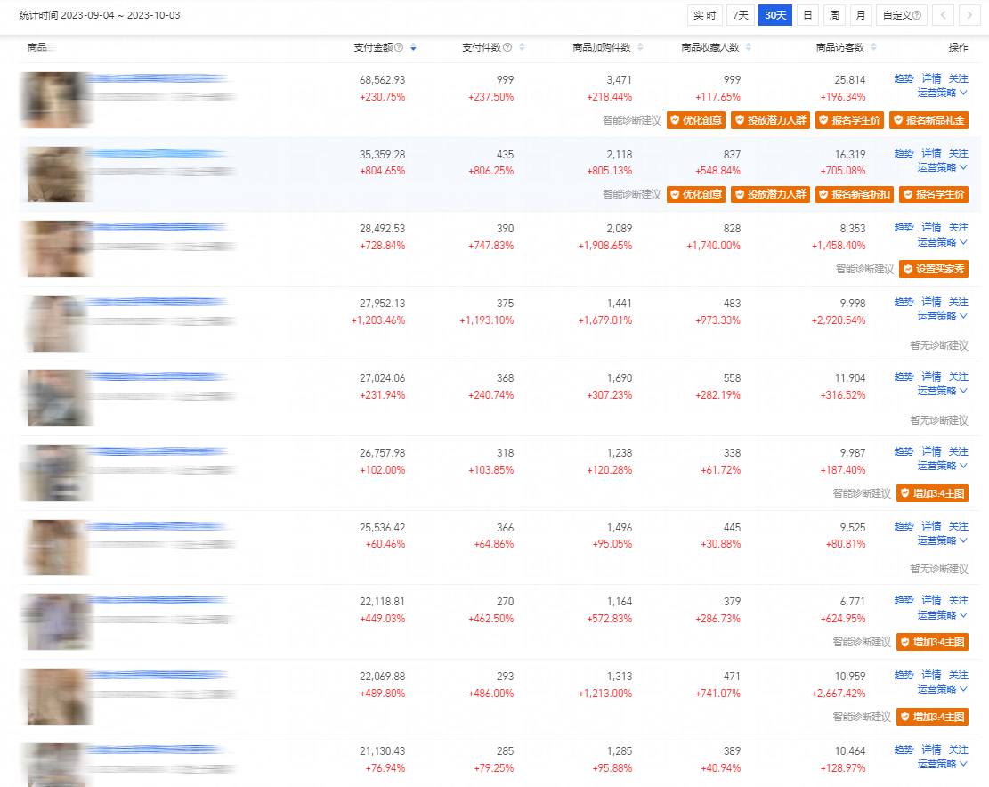 九月底,林海的店鋪抓住了家居服飾行業的熱感式“上新引爆”,新品曝光量26W+,成為不少年輕女孩加入購物車里的寶藏清單,主推品單月賣出1400+件,帶動店內其他產品銷量,支付買家數達1W+。